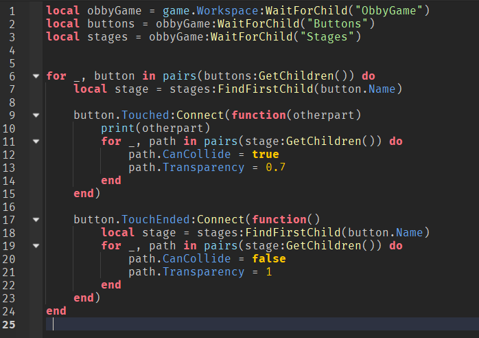 So hopefully you know those basic two-player obbies where you touch a button and the path appears, and when you get off the button, it disappears. I’ve basically accomplished that, but I’m having the problem where slight movements on the button cause the path to turn off/on.