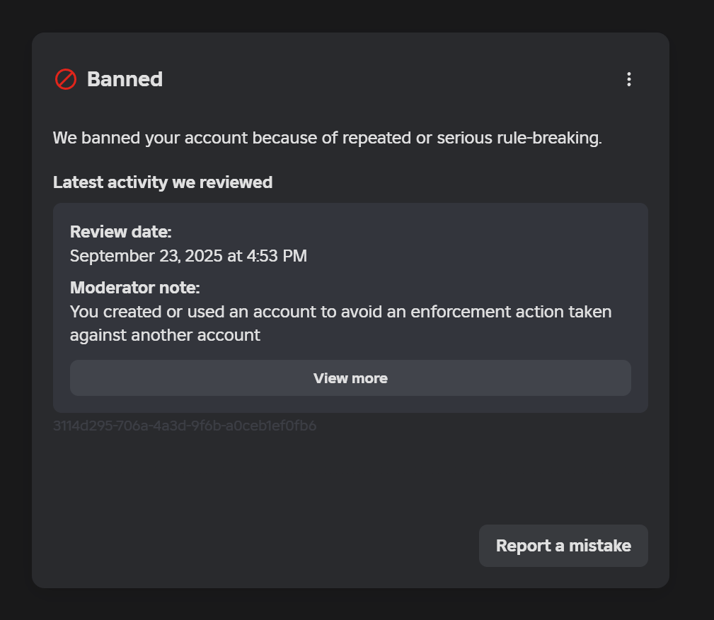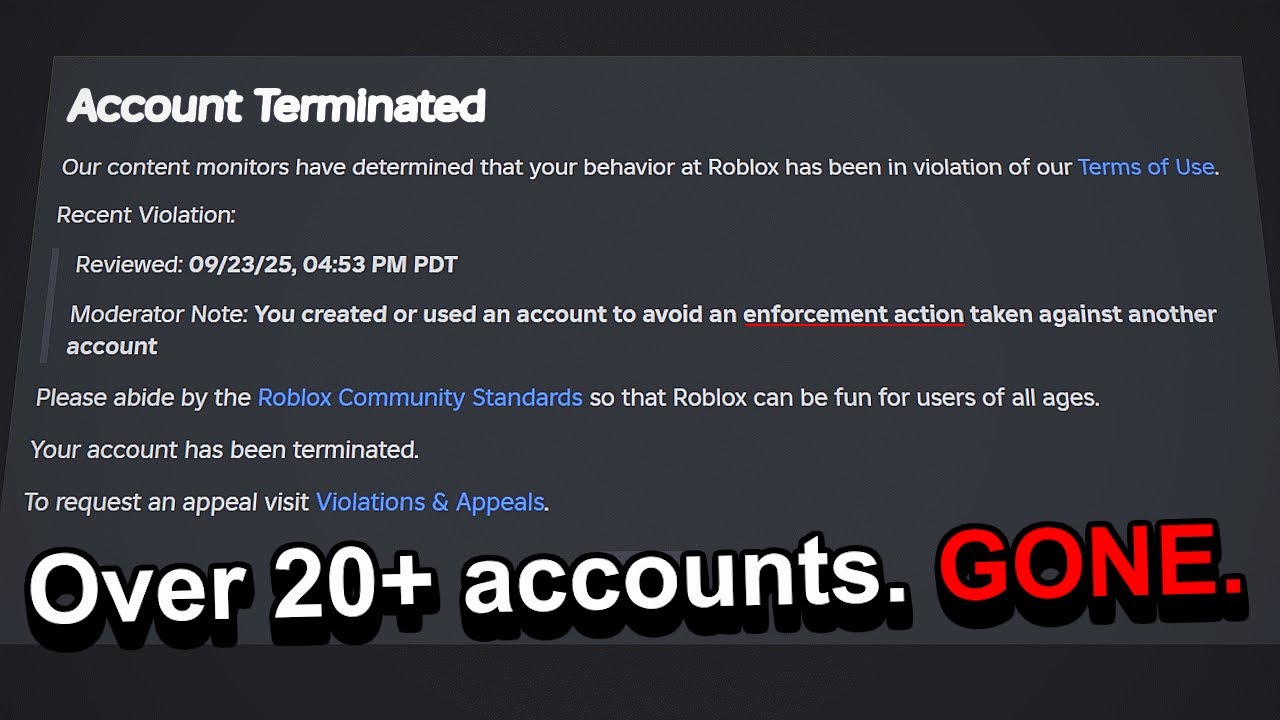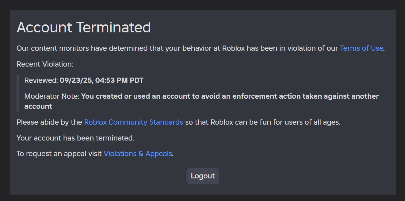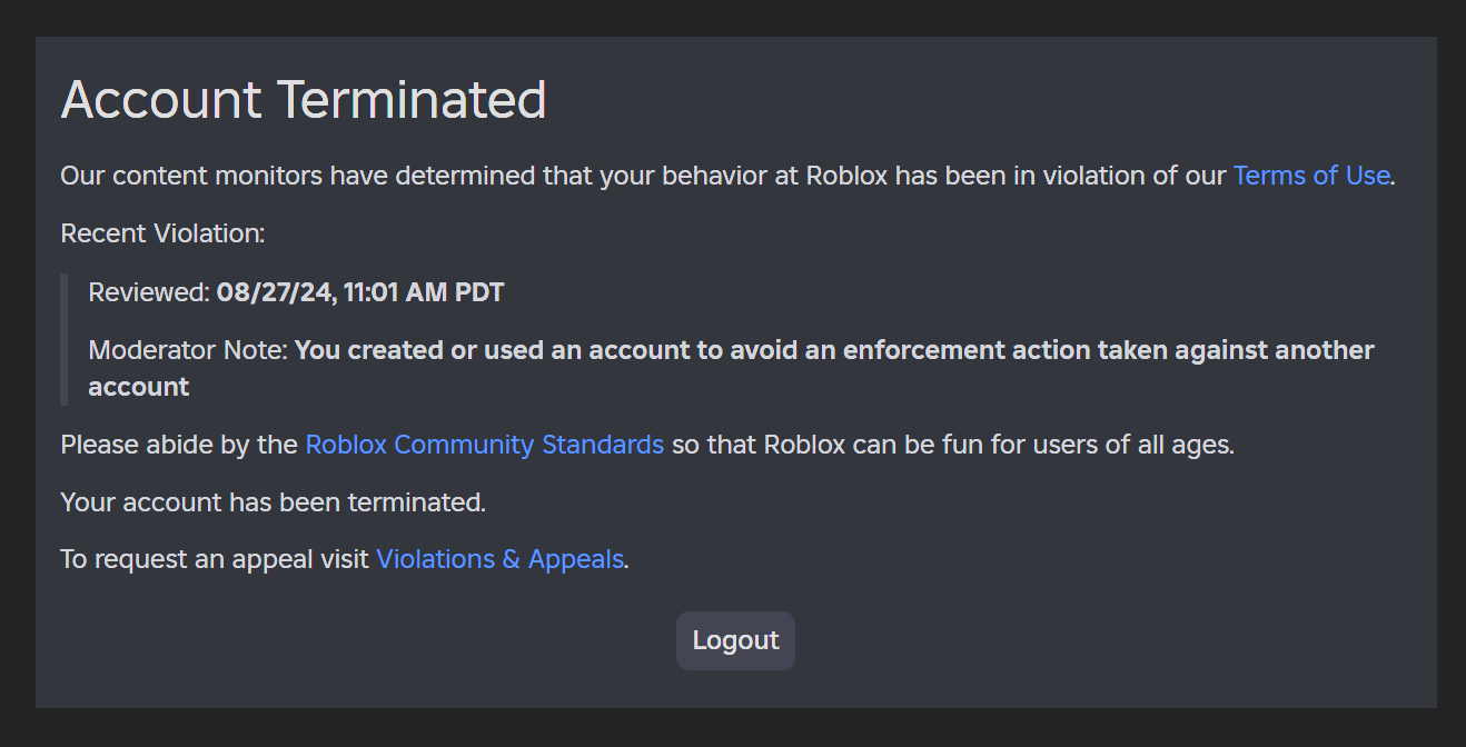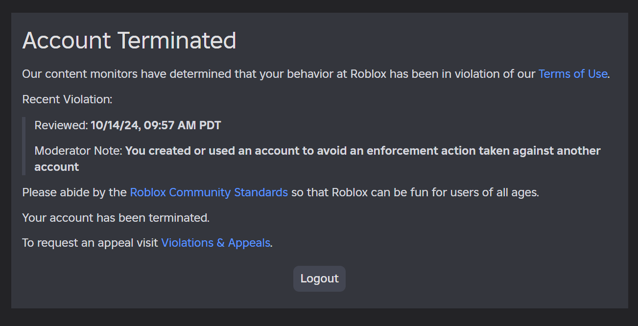 My account that I use to DevEx has now been terminated for “creating or using an account to avoid an enforcement action”. Not only is this completely vague and tells me absolutely nothing. I don’t even know what this is supposed to entail or imply. If I was trying to avoid enforcement action I wouldn’t be logging with the same IP or device, this is so dumb. I make millions of Robux on this account and it’s one of my main sources of income and it’s being stripped away from me because some guy can’t even be bothered to do the absolute bare minimum.