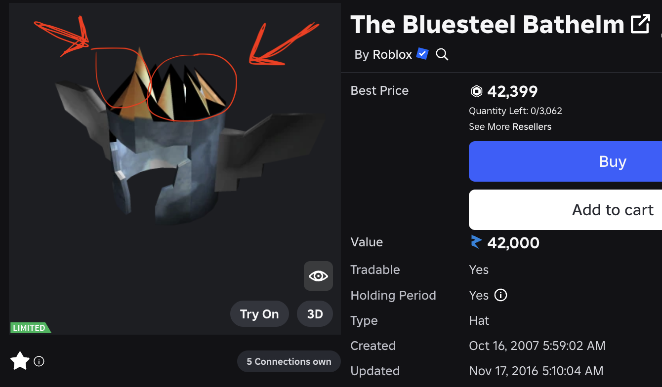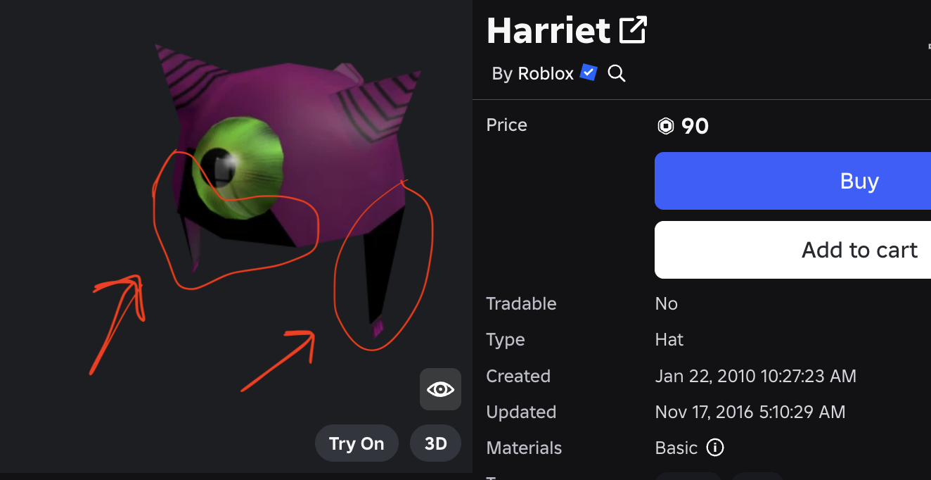 These items did not originally have this weird thumbnail discoloring anomaly, and considering the items do not look like this in-game, I think it’s best for the thumbnails to be fixed so the items are best represented by the front page-picture. Also 2 of these, the bathem and harold are also officially made ROBLOX limiteds.
