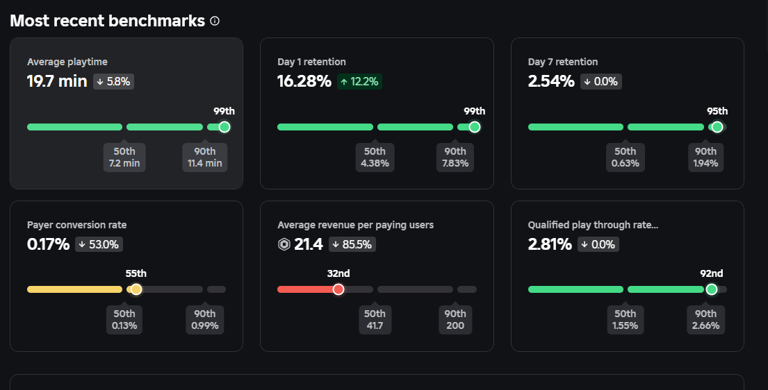 What confuses me is that I see other obby game developers complaining about 0.2-0.5 Robux/visit, while ours is sitting at just 0.03 (!!!). Given our decent retention etc. and very high like ratio, I would have expected the monetization to be at least closer to average.