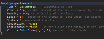 I added two new variables to customize! The first being the Type which can be “Volumetric” or “Flat”, then the cloudHeight which determines the height of the volumetric clouds. For higher values its recommended to edit the layers variable inside of the CloudsClient.