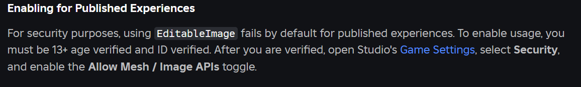 To use the Editable Images API you have to enable on the Security tab of your Experience’s game settings the “Allow Mesh/Image API”