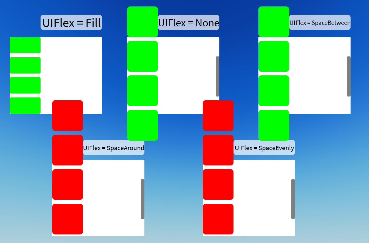 When you create a ScrollingFrame, set its AutomaticCanvasSize to Y and set its CanvasSize to 0 (to enable complete resizing), the following will happen if you place some children into the scrolling frame based on what the VerticalFlex is set to: