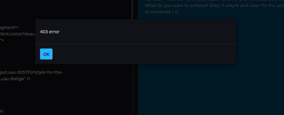 I’ve been trying to publish my topic for like a day now, tried clearing my cache, going into incognito mode, using a different browser and even a different device but nothing does the work, when I click post I have this “403 error” from the server.