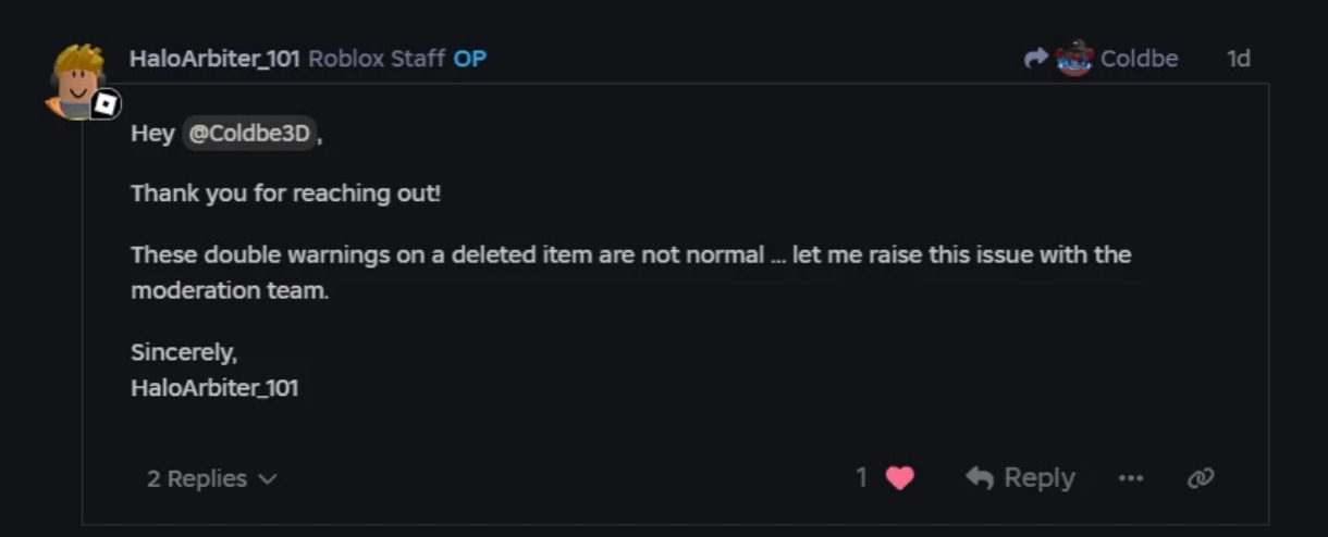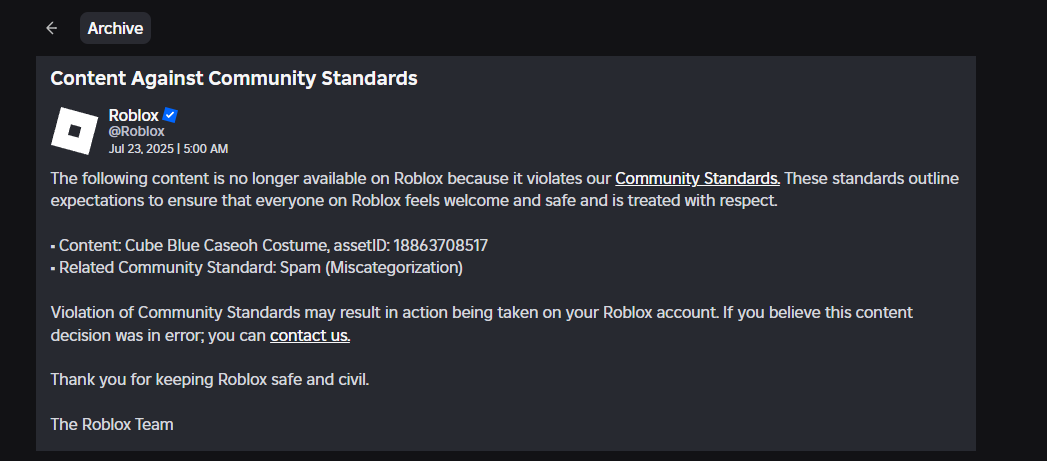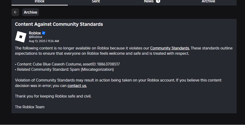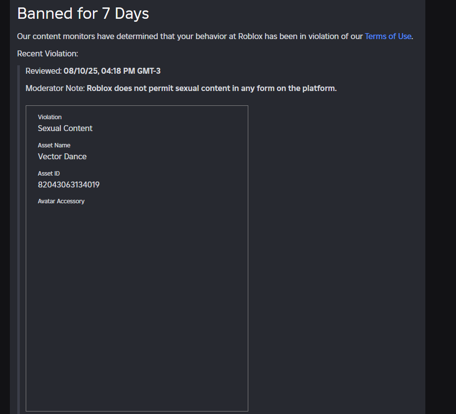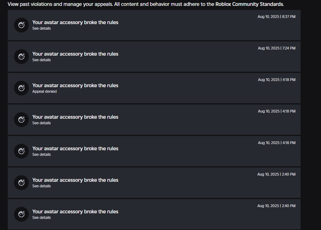Hello, on August 10th, 2025, my account with the username Juauzin was suspended for 7 days due to an emote asset I had submitted. On the same day, I received another ban for the same asset, which resulted in my account being terminated. There were 7 repeated violations from the same asset. If my account was already suspended, it wouldn’t have been possible for me to commit another violation. I even submitted a support ticket, but so far I haven’t received a response.