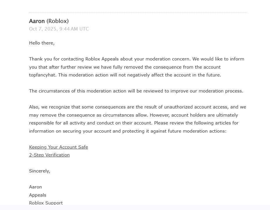 Account Terminated incorrectly flagged by the system automation after roblox said it they took all consequences off my account - NEED HUMAN REVIEW