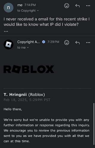 Not only is copyright manager refusing to tell me what IP I allegedly infringed on. Roblox appeals is also giving me an entirely different reason for my termination completely opposite to what my ban note had said. Roblox also usually gives you an email when your striked for Ip infringement giving details however I did not receive such email.