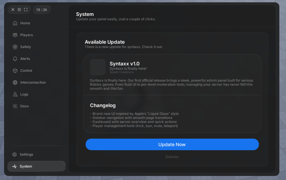 The name is Syntaxx. A fast, intuitive, and free admin panel built to give you full control of your game.