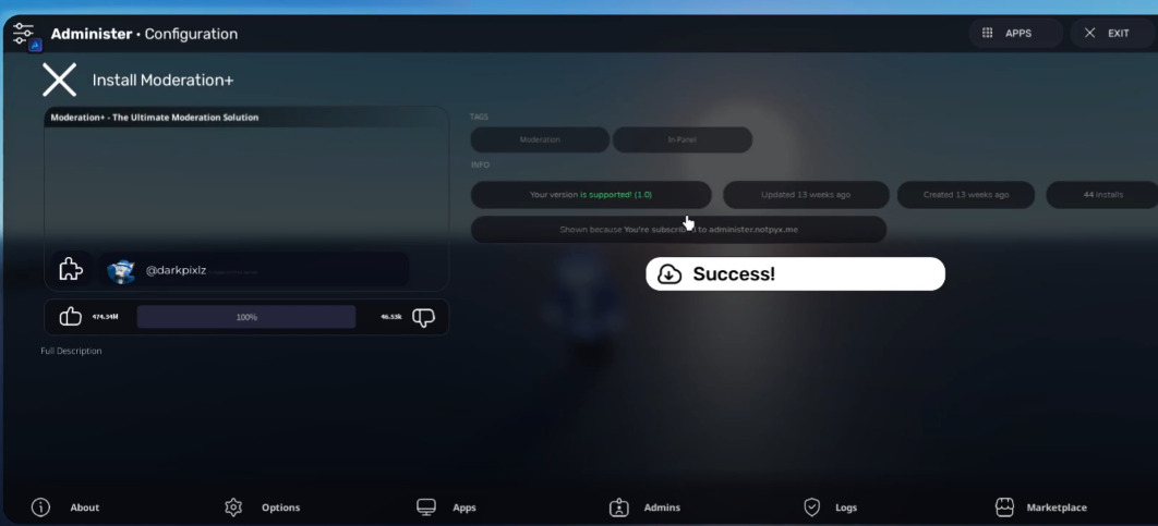 Administer has an intuitive admin panel that anybody can use. However, for the sake of simplicity, it comes with only one app. To install an app, go to the Marketplace in Configuration and then reload your servers. Think of apps as groups of commands each with their own options and abilities.