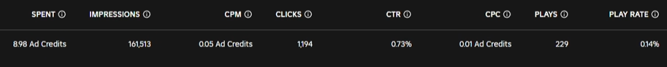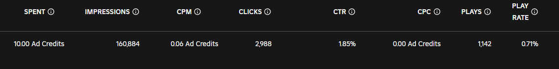 Ye I don’t know what’s going on, when I ran one for 10 ad credits I got a similar amount of impressions to you