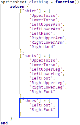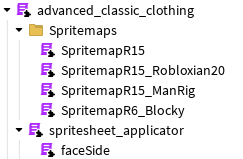 - Changed “spritesheet” to “spritemap”, the modulescript which applies the clothing onto the character’s body.