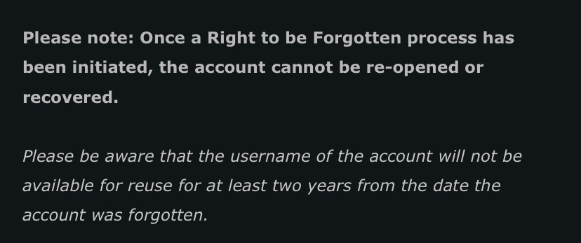 Oh and upon submission of a RTBF request please make it more specific upon release instead of at least 2 years and change it around to 30 days or 2 years since thats how it works now clearly.