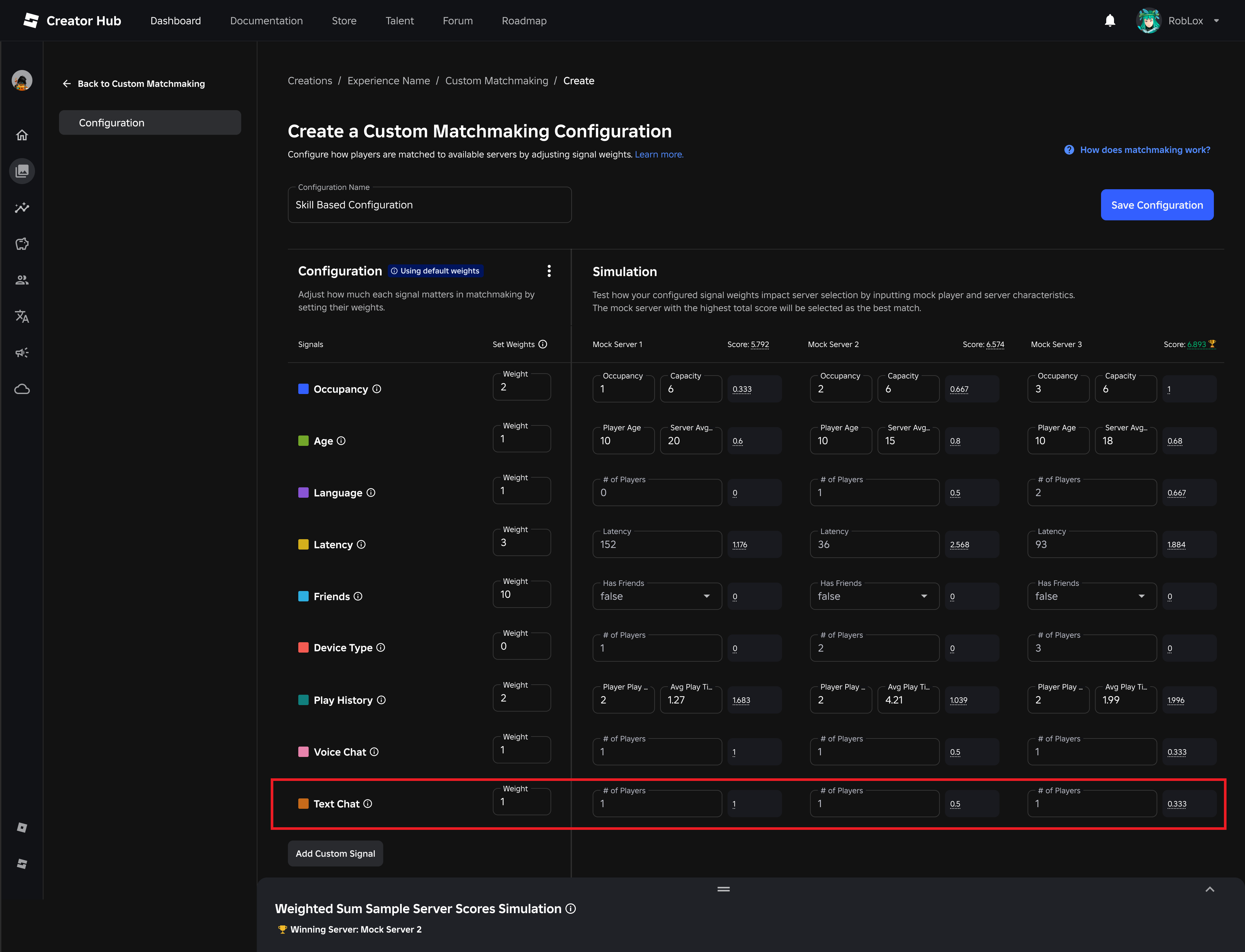 With the recent rollout of Custom Matchmaking, we’re introducing a new signal called “TextChat” in early December. You can use this to influence the likelihood that users who are able to chat are matched together. This signal will consider if the user has Experience chat enabled, has completed an age check, and if they’re a similar age to other users in the server. This will be added as one of the signals in default matchmaking. You can adjust the signal’s weight with Custom Matchmaking in your experience’s dashboard on Creator Hub.