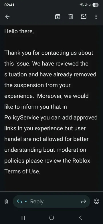 Roblox replied to another game of mine they took down last week and brought back up same day with no notice or appeal reply, then they replied today with this with typos…