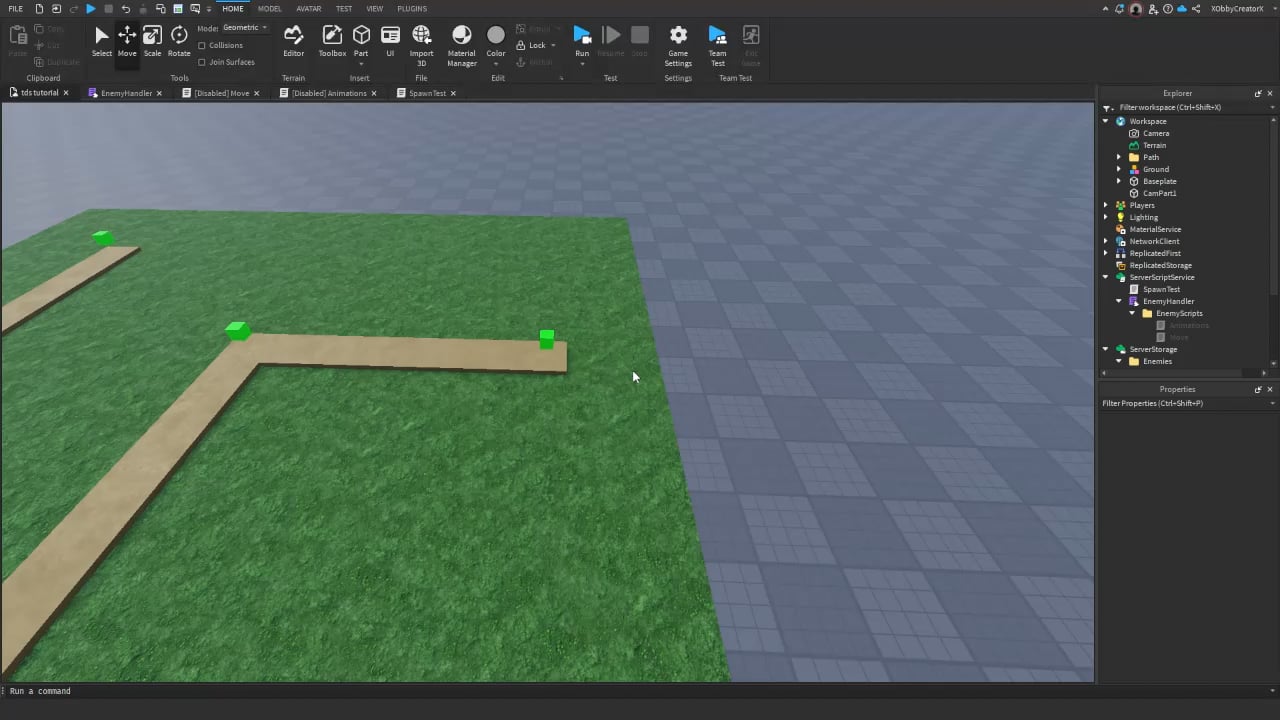- Now that that’s done, we’ll move on to the actual path positions that the enemies will be moving to. To get started, place 1x1 parts on the starting and ending point of the path, as well as on every intersection of the paths you’ve made. You can place the parts 1 stud above. Like so: