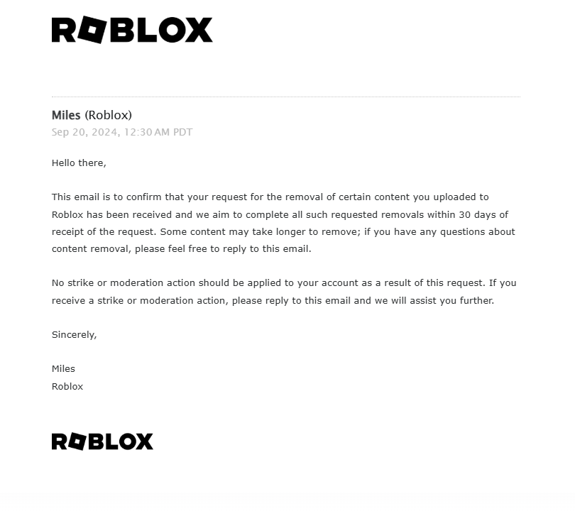 About a year ago, I reached out to Roblox Support requesting the deletion/archiving of some of my items that I felt might be considered a bit controversial. I uploaded these because I knew these words were trendy at the time, but I didn’t actually understand their meanings. Once I informed myself about them, I quickly put them off sale and asked to delete them. However, a few months later I was punished despite trying to remove the items from the marketplace. My intentions were never to break Roblox’s Term of Use whatsoever.