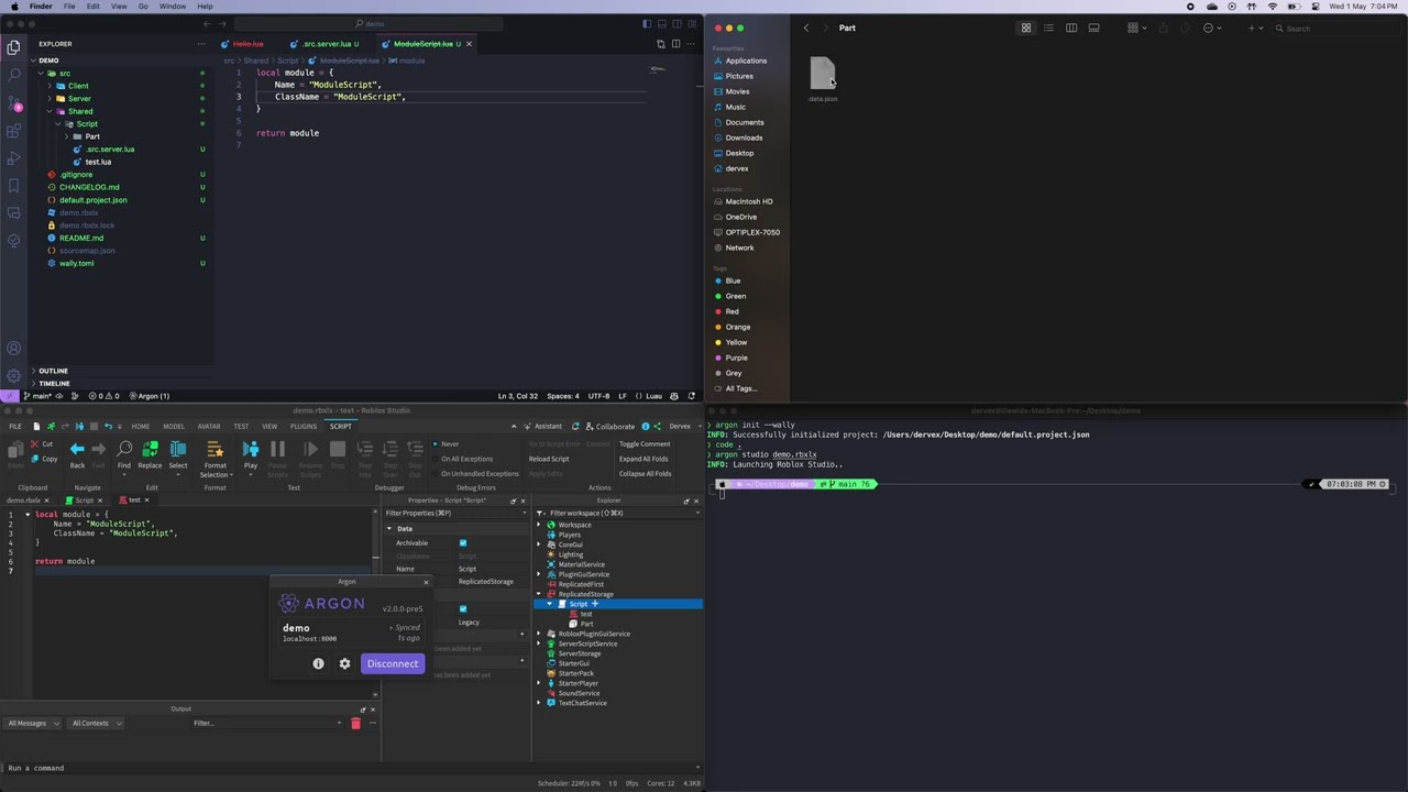 Argon is a powerful tool that improves Roblox development experience. It consists of CLI - the core part, this is where all the processing takes place, VS Code extension - a user-friendly CLI wrapper, and Roblox plugin - required for live sync.