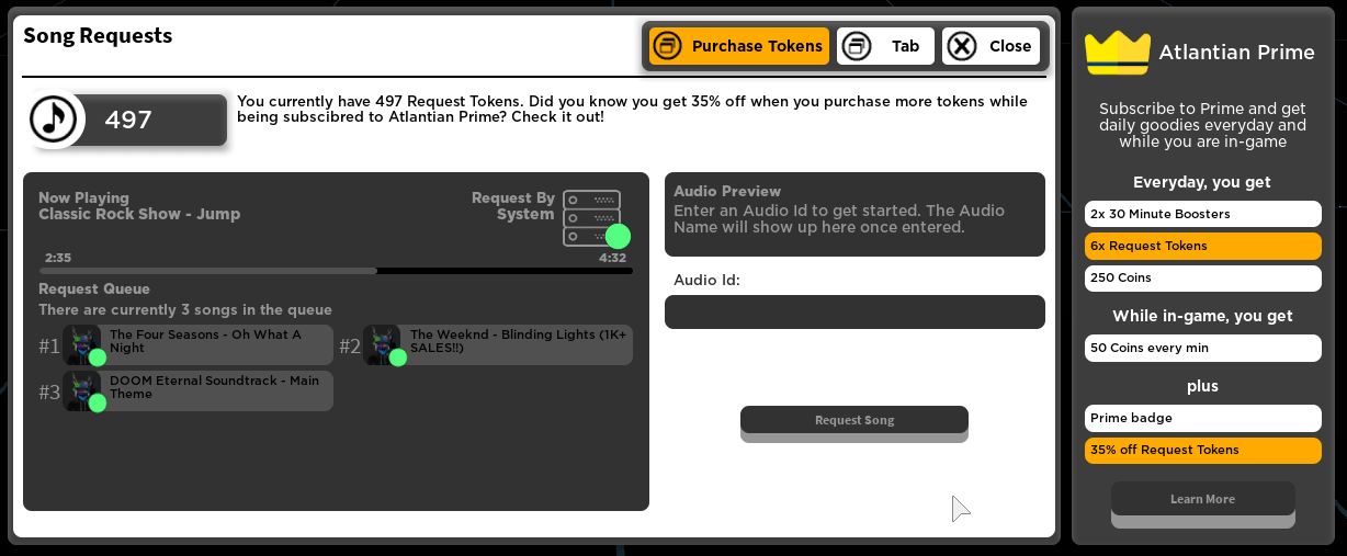Request Tokens - Tokens are needed to request a song, and can either be purchased or gained by other ways described at a later date. This is a move to make sure there is another source of income to keep the game alive and active.