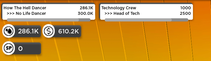 Introducing the new UI to display your Experience, Money, Staff Points and Group/Dance Ranks (Gif 1) (to replace the old big banner at the top) - This will allow you to see all your important numbers, as well as giving you info such as how much experience left to level up.