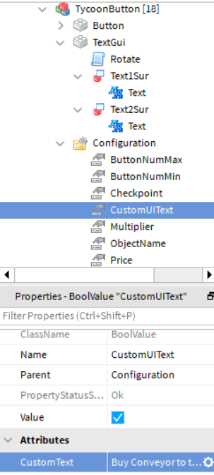 Recently tried implementing attributes via boolean values into the config folders of my tycoon buttons so that I could change what it said players were buying if needed (the attribute is supposed to change the overhead surface gui text) but for whatever reason this specific line refuses to work: