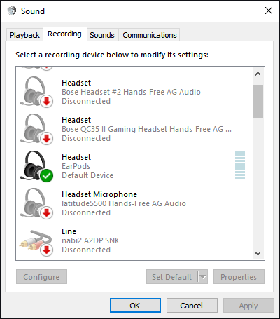 Do the same for the recording section. But this time, make sure the device is a WIRED device, not the same as your playback device. Do NOT set this device to your Bluetooth headset!