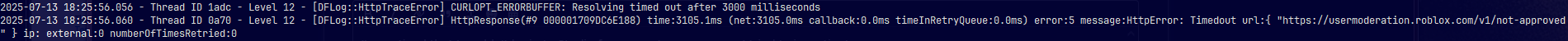 In my opinion, the 3-second timeout is too low because when I first got this, I thought the servers were down (i was in a vc perfectly fine). Changing the timeout to 8-10 seconds or even 6 seconds can communicate better that your internet is trash. There could also be a fast flag that lets me change the timeout at will as RSMM shows other flags that are like this.