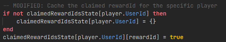 After investigation, we discovered that the in-script cache for claimedRewardIdsState (and potentially trackState which caches premium pass ownership) appeared to be global rather than per-player. This meant that once a reward was claimed by any player in a server, or a premium status was cached, it could affect the state for all other players in that same server instance. This behaviour isn’t easily noticeable during private testing due to the low player count.