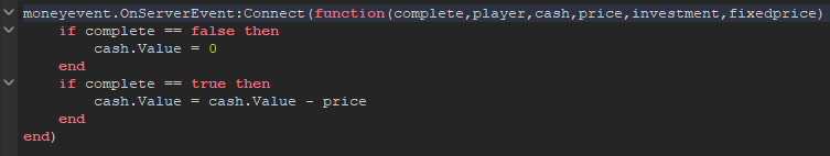 game.ReplicatedStorage.Money.OnServerEvent:Connect(function(investment,player,cash,price)