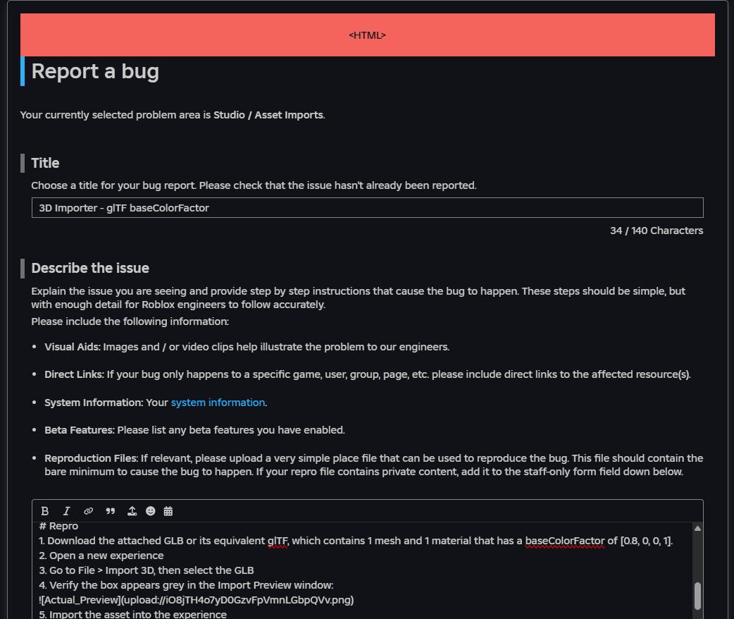 I’m having trouble submitting a bug report form. I suspect it has something to do with the markdown I used, but I’m not sure what.