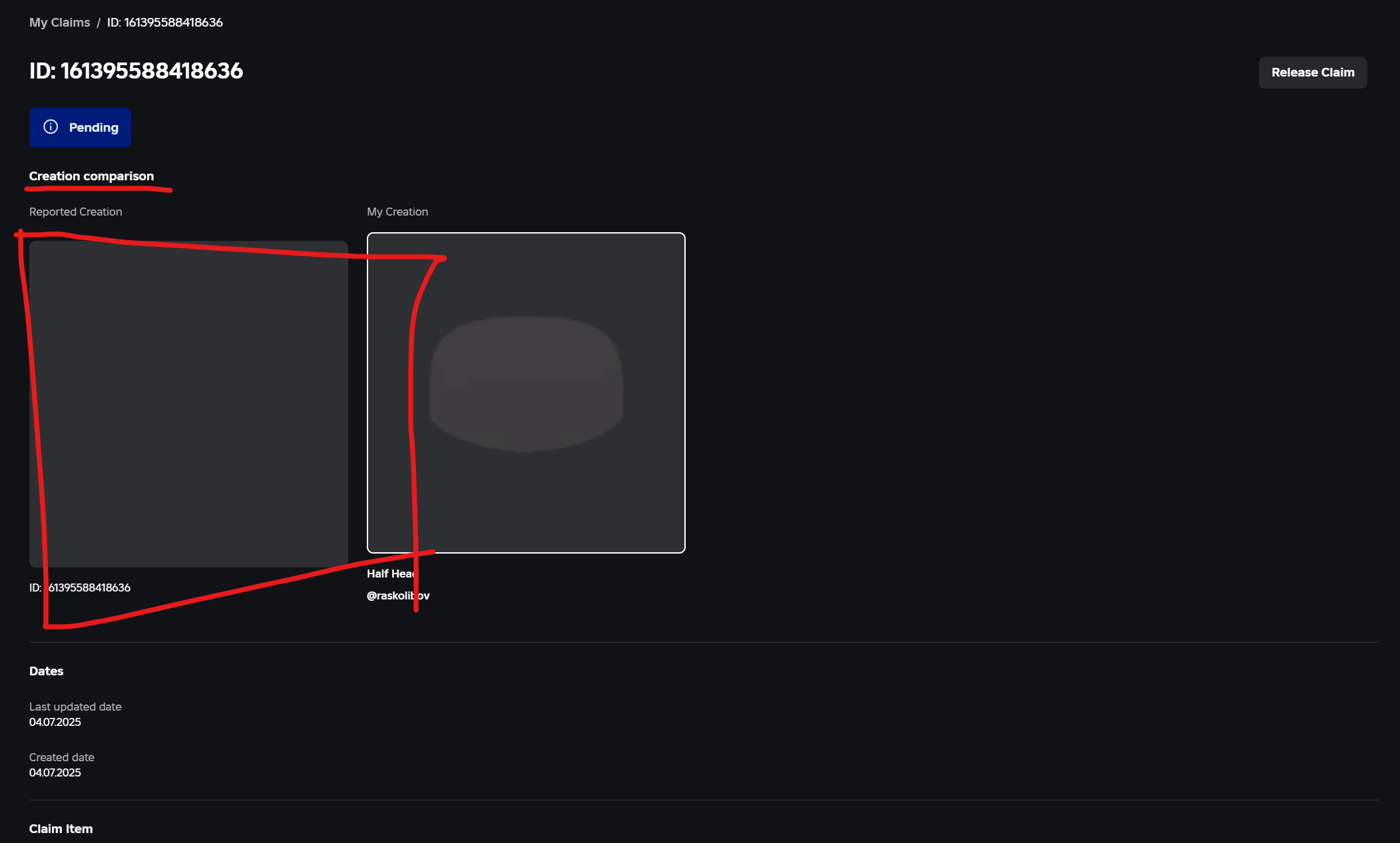 Instead of being marked offsale (as expected), the bundle appears as if it has been deleted or is otherwise inaccessible. This completely breaks the Creation Comparison functionality — the reported asset’s image does not load, and neither the reporter nor any party involved in the claim process is able to visually compare it against their own content.