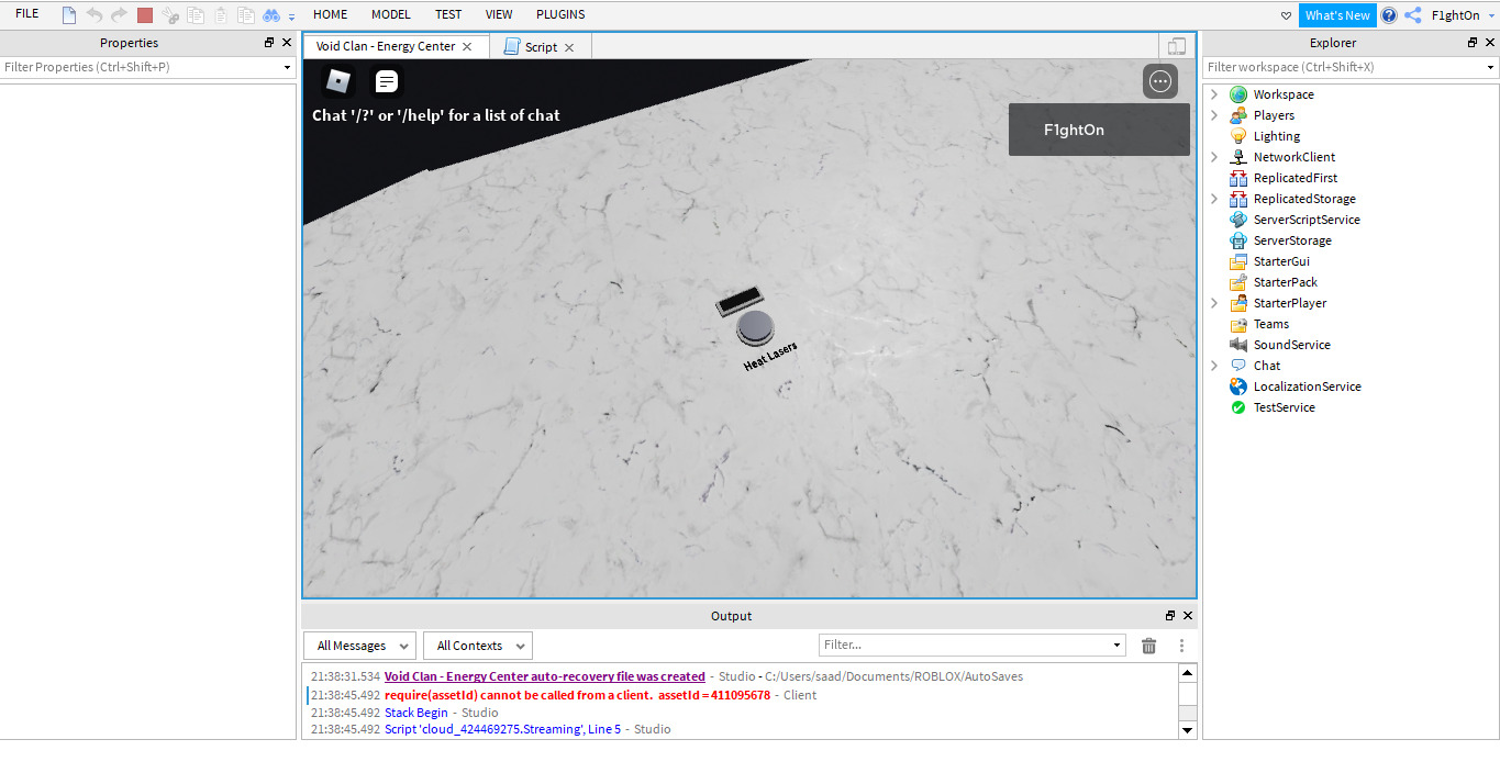 I am trying to get the part named “Neon” to turn green (Shamrock) when the button is clicked. The button is the part named “Button” with the script in it under “HeatLasersButton”. However, for some reason, the click detector is not showing up when I try to click / hover over the button.