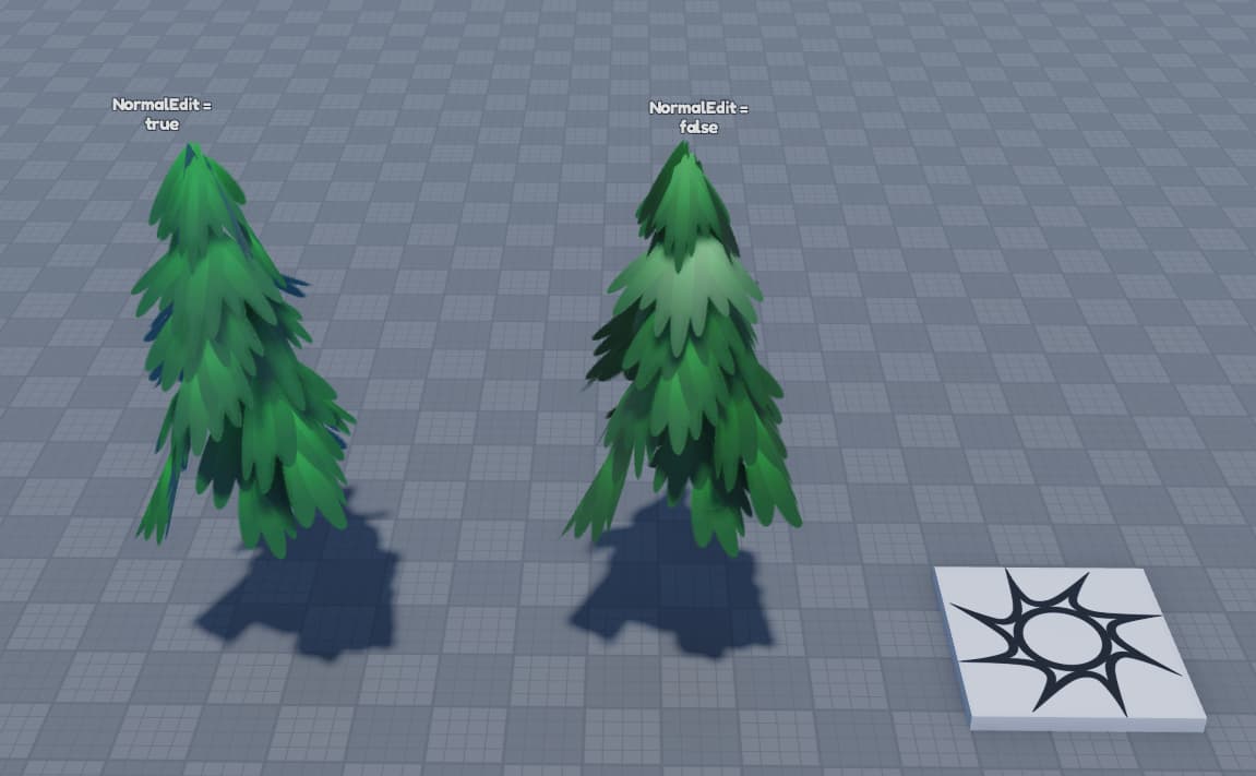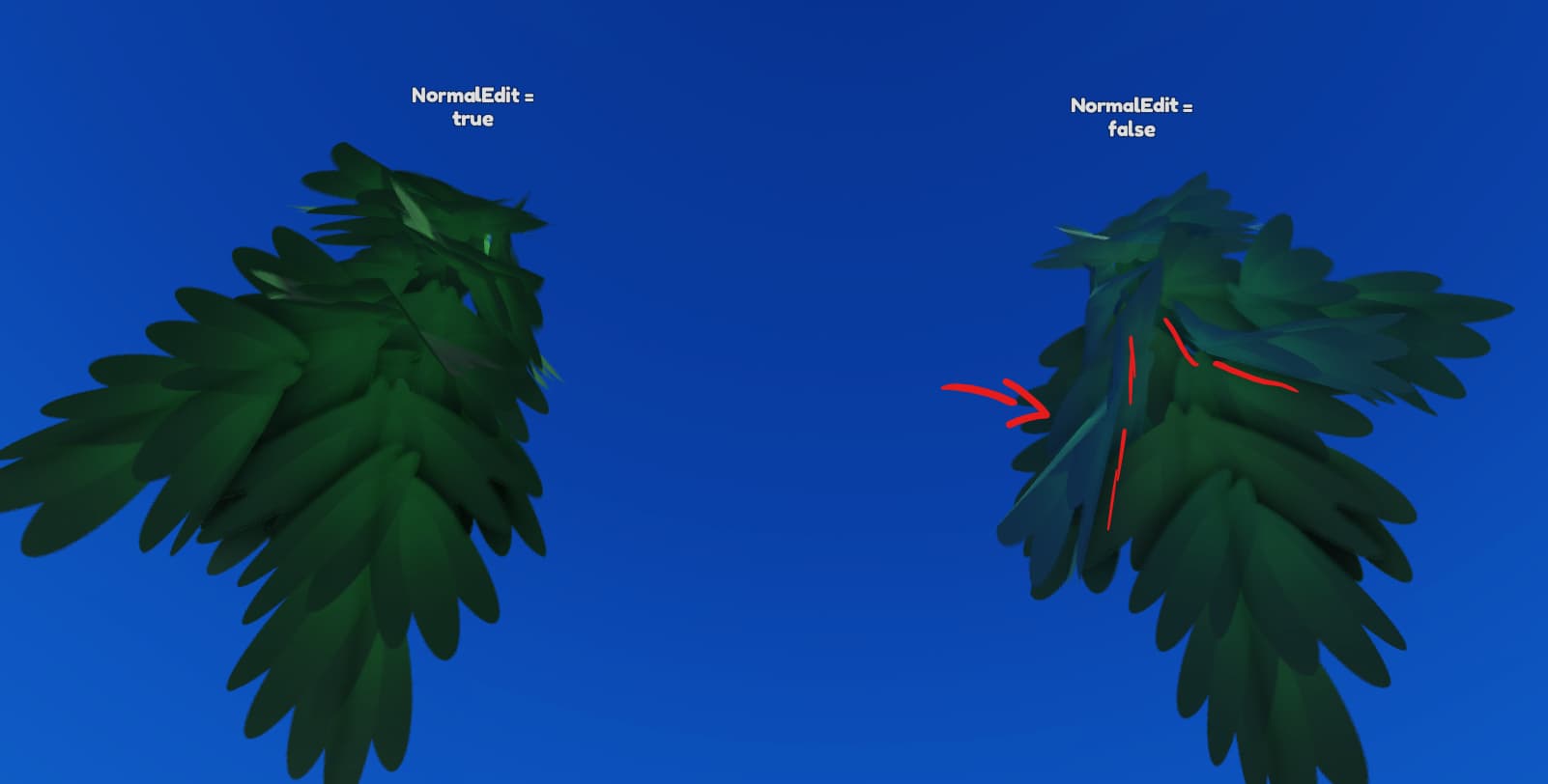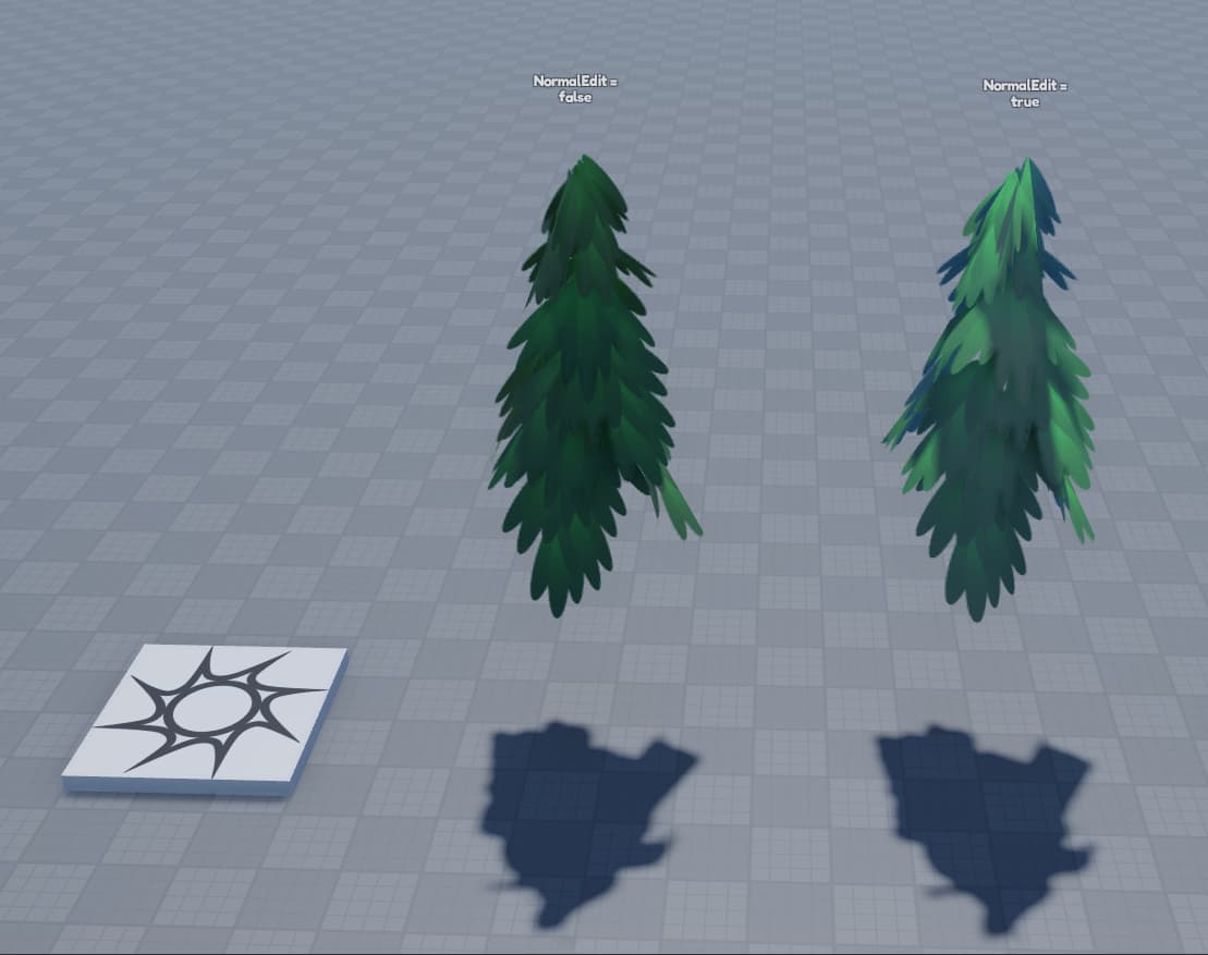 Here’s a picture of this tree in Studio, one with the NormalEdit mod, the other without. They look similar on the lit side: