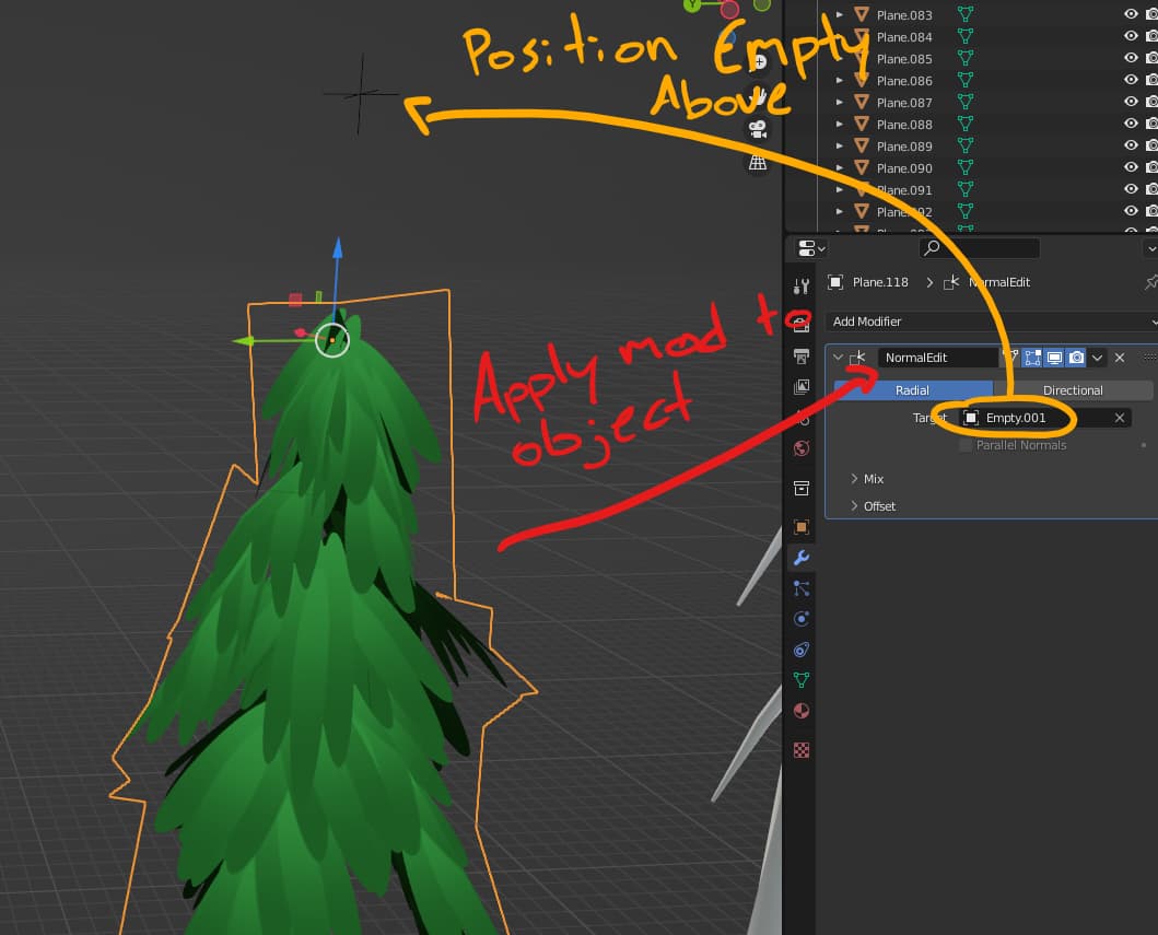 To fix this, most artists will apply a NormalEdit modifier to their Object. This will make the Normal direction data “act” like it’s all facing one uniform side, that way, all of one side will be lit the same way, and the undersides will be unlit the same way, similar to how real tree leaves act as light passes through. Also double check that your object is using Smooth Shading, and that Autosmooth is enabled (I think autosmooth is required?)