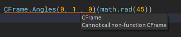 game.Workspace.Tween.CFrame = CFrame.new(0, 0, 0) * CFrame.Angles(0, 1 , 0)(math.rad(45))