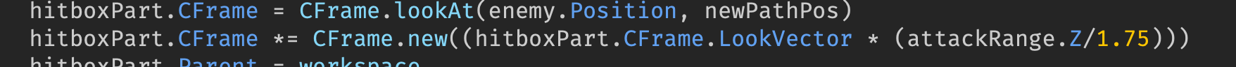 I’ve found a work around to this problem though. I get the position that is x (very tiny amount, in this case 0.1) studs in from of the enemy on the path and then use CFrame.LookAt() to get the direction the hitbox part has to look.