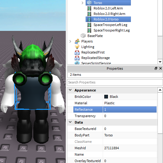 If you set the transparency to 1, it’s invisible. If it’s .5, it’s hard to notice that you can see through it. If you set it to .9, .99, .999, it’s hardly see-through. It doesn’t do reflectance at all. This is with the BaseTextureId and OverlayTextureId set to “”, shirt and pants removed.