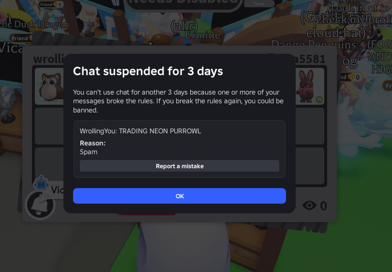 While playing Adopt Me trying to trade the neon purrowl I got, I mentioned in chat that I was trading it. All of a sudden, this message pops up. Tried again on an alt thinking maybe it was because I mentioned it twice too soon apart, and that account then got suspended for 3 days. Mind you, I hadn’t said this phrase but maybe a few times not even back-to-back in a spamming fashion.