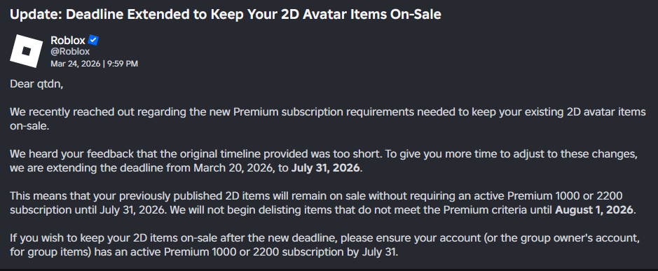 If you wish to keep your 2D items on-sale after the new deadline, please ensure your account (or the group owner’s account, for group items) has an active Premium 1000 or 2200 subscription by July 31."