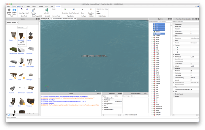 The first bug is really easy to explain and repro, basically when you first open one of your places or a new place, move or edit just one thing and then press cmd+z to undo it you will get this screen and it won’t go away until you immediately press shift+cmd+z to redo what you just did. If you get that screen and then edit something else then you have to ] close and reopen the place (not studio) in order to remove it. I also just found that a “message” object appears in the workspace and you can remove it by deleting that.