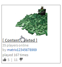 The results shown on the games page are cached for a couple of minutes. Looks like what happened here is that the name of the game was content deleted, and then afterwards the creator changed the name again to “Play for free robux.” You saw [ Content Deleted ] because that was the name a few seconds/minutes earlier.