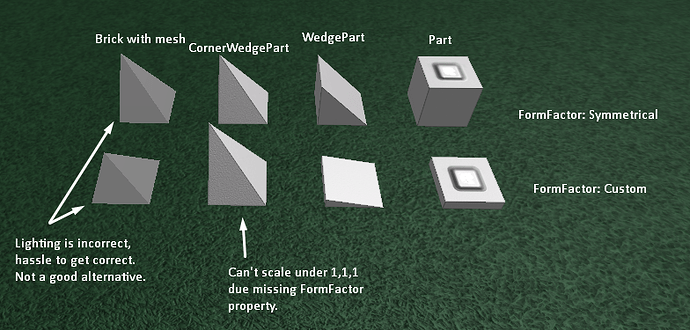 I’m still not sure why FormFactor was ever even a thing (let’s make a property that disables logical behavior and turn it on by default!) but by now it’s probably here to stay and we might as well make everything a FormFactorPart. Making arbitrary-sized corner wedges from CSG is annoying and I’d really like to use the CornerWedgePart for what it was really intended for.
