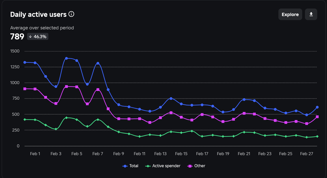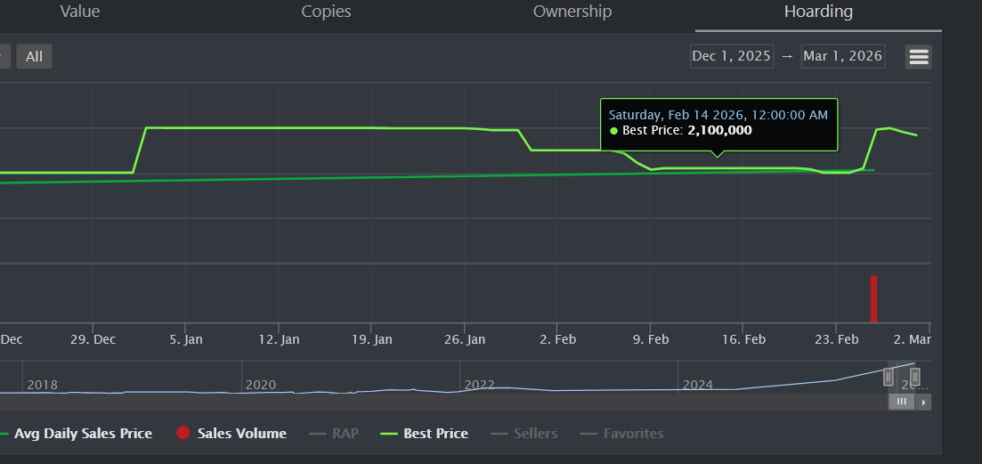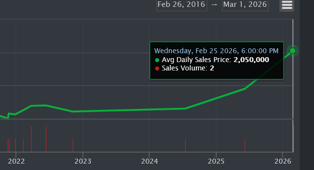 Compare this to the Rolimon’s chart below, which gives us clear sale data - 2 sales on 2026-02-26 UTC, averaging 2.05M together. Much easier to read!