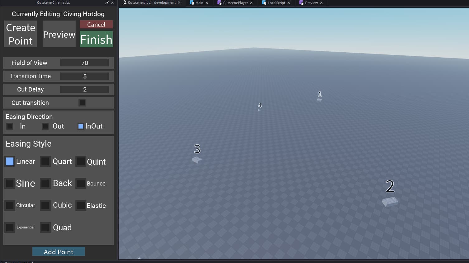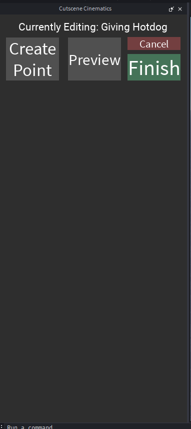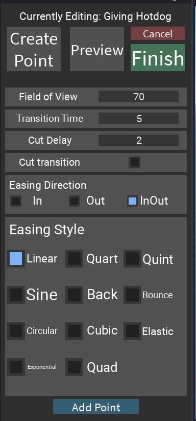 In order to make your cutscene you need to press the “Create point” button. This will allow you to edit certain properties to customise the cutscene for your liking.