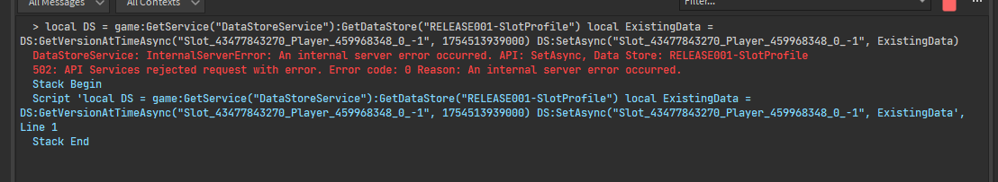 DataStoreService: InternalServerError: An internal server error occurred. API: SetAsync, Data Store: RELEASE001-SlotProfile