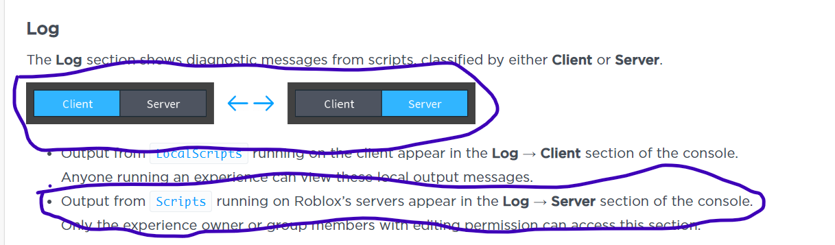 Output from Scripts running on Roblox’s servers appear in the Log → Server section of the console. Only the experience owner or group members with editing permission can access this section.
