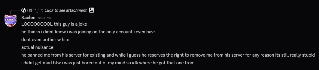 “i know the cycletable’s an alt because kaelen got so mad he joined my serverand forgot he was on his normal discord account”