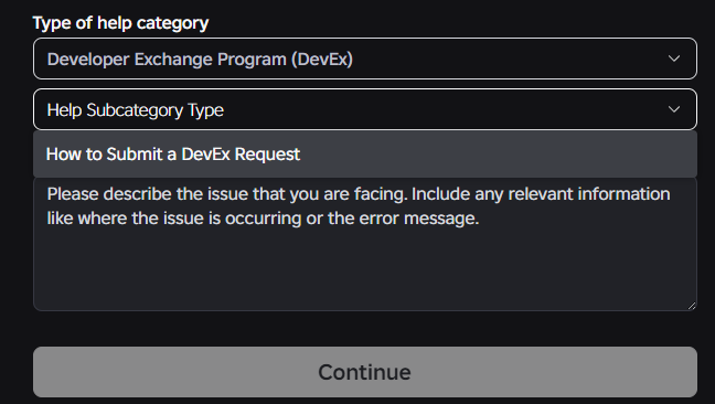 I’ve been meaning to Dev-Ex for a while now, and I have incorrectly submitted the first name field in the Dev-Ex Request (on the creator page). When trying to go to support to fix the name (trying to change it to my parent’s name instead of mine), there is a lack of a category for a support ticket.