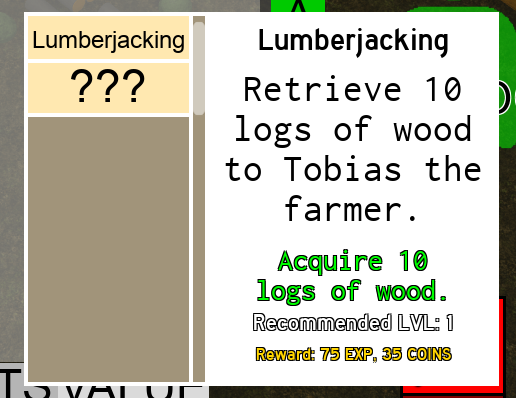 Note: the script that makes the quest gui (such as the ‘Lumberjacking’ quest) visible is handled in another script. You can find the script under “–second script”
