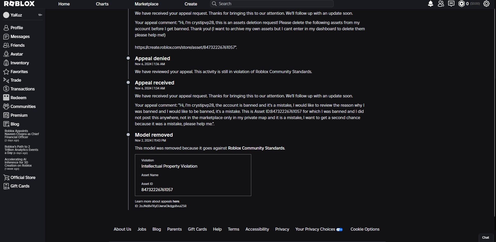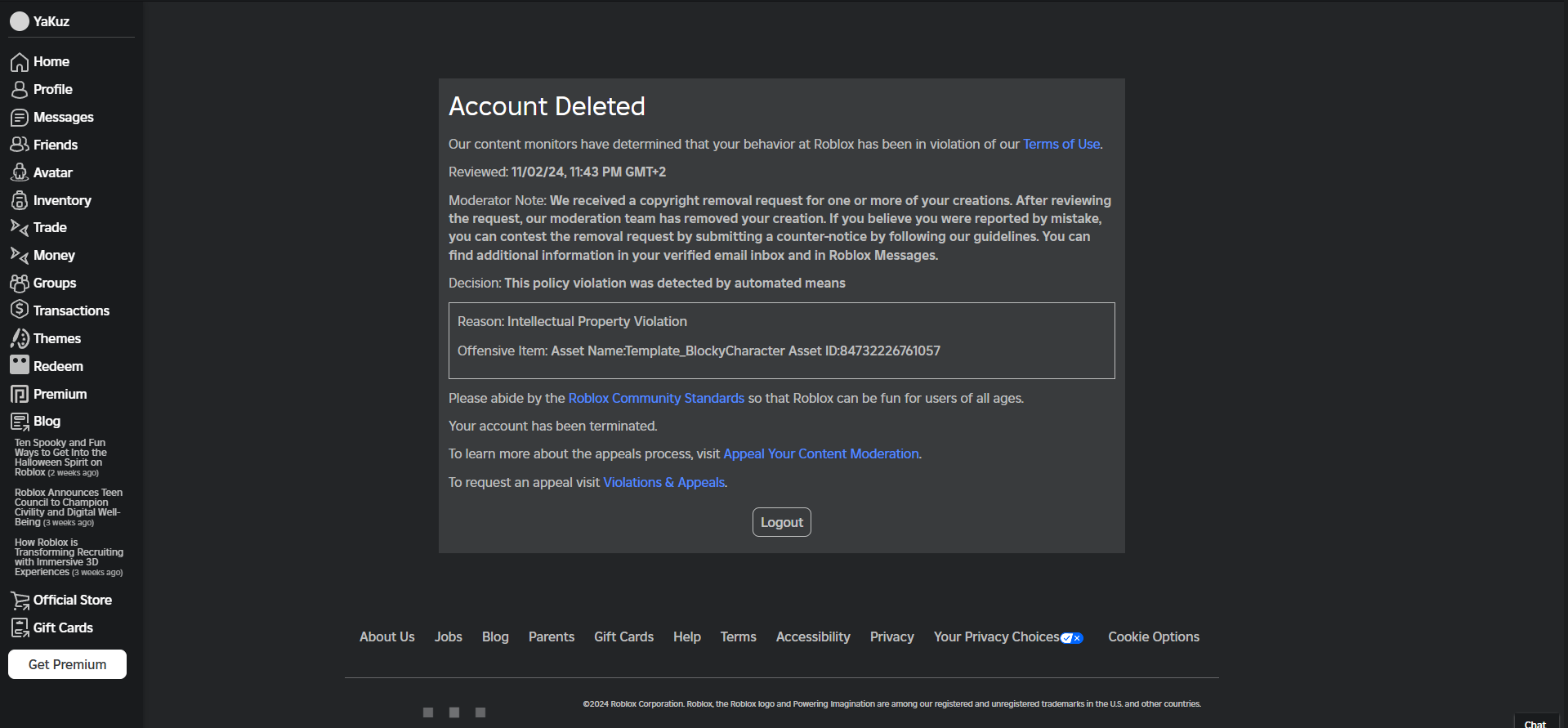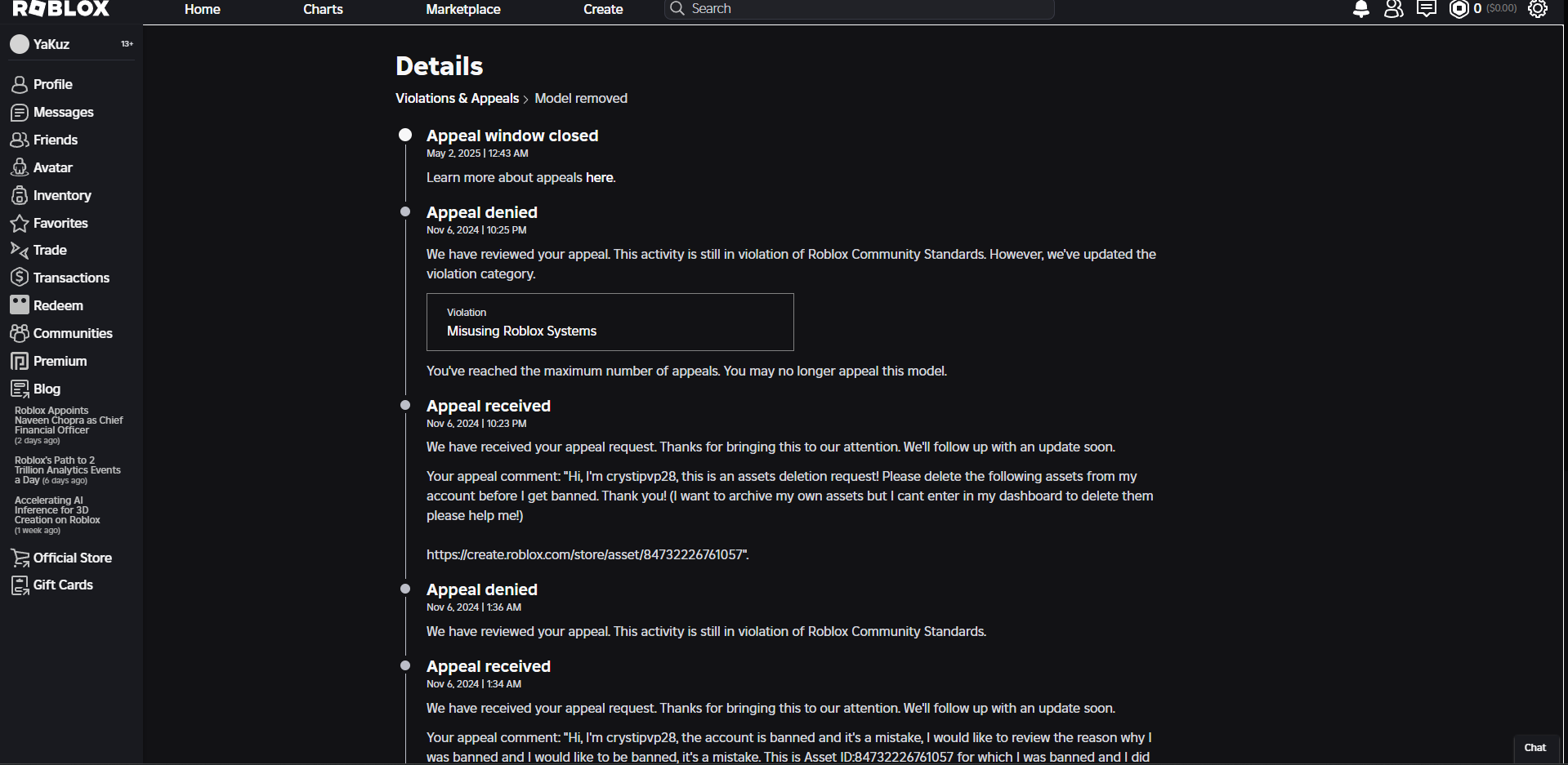 Hi, I’m crystipvp28 (Yakuz), is been 7 months when my account was terminated with my all works in it: assets, robux, groups…I write this right because my account can’t be restore and post this topic/post just for me because life teach me to DO NOT TRUST IN ANYONE, and my account got 3 strikes for assets I uploaded on my studio/map, that map was not published that asset was not published in marketplace or to sell somewhere (I’m Modeler/Builder, I was), one assets was mine, and another two was from a guy who give me to rig a character like a comms but this was sketchy guy who friend request randomly on roblox and which has verified on his account but I think doesn’t matter that, was matter 7 months ago because when I saw a verified user give me a friend request like I was “omg I got a friend from verified a account on roblox” in that moment I was happy because like a very small developer you don’t get this in every day (I think in that moment I didn’t was mature enough to idk understand “you are the product” or something like that and he find me on roblox from marketplace because I post some UGC like swords, character rigged by or clohing 3D to be wearing on R15…), asking me: “How much do I get from UGC” ; “How many robux do I have” ; “If I want to make more robux”, I think this was a point when I thinking something is not right, but I didn’t know that and he ask for “Blue app”: Discord and our conversation continue there, he give me a character to rig for his game but I think was not for a game, the file was not mine and I didn’t know he will give me a KILLER ASSETS/MODEL (WAS STEVE FROM MINECRAFT) the bad thing again I didn’t know that (I didn’t that model it will be moderated and to get a copyright strike, because if you search on toolbox you will find a lot ) and I trust him, I make that rig for that model/character and moment to test if it’s works in studio I uploaded first time and I didn’t like something I return to blender to change some BONES after approximately 30-45 seconds I re-uploaded again in studio to test again and the warning was not applied in that moment when I upload first time of that character, like after 15 minutes I got warning 3 days banned and after that I refresh the page my acount was terminated, only because I trust a person in some seconds all my works, robux, groups, assets I made gone, I applied for an appeal but doesn’t work, again this happened becauce I trust in people, and that’s why I write this post.