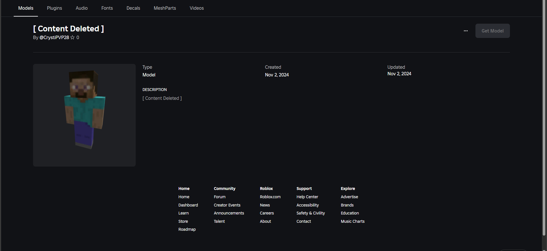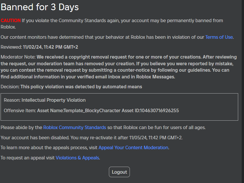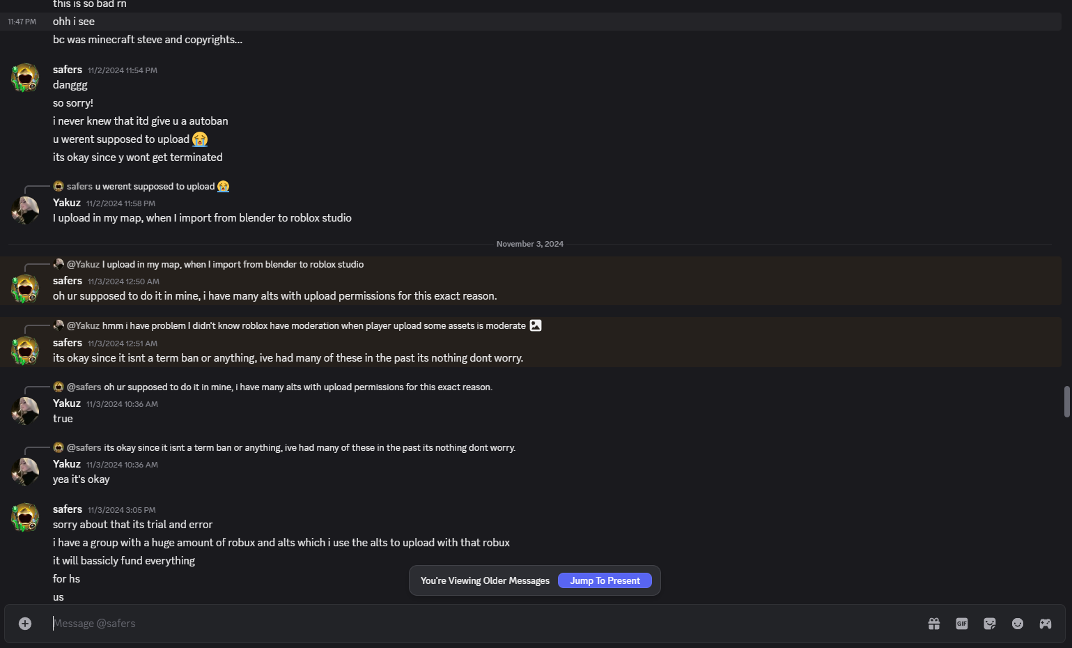 Hi, I’m crystipvp28 (Yakuz), is been 7 months when my account was terminated with my all works in it: assets, robux, groups…I write this right because my account can’t be restore and post this topic/post just for me because life teach me to DO NOT TRUST IN ANYONE, and my account got 3 strikes for assets I uploaded on my studio/map, that map was not published that asset was not published in marketplace or to sell somewhere (I’m Modeler/Builder, I was), one assets was mine, and another two was from a guy who give me to rig a character like a comms but this was sketchy guy who friend request randomly on roblox and which has verified on his account but I think doesn’t matter that, was matter 7 months ago because when I saw a verified user give me a friend request like I was “omg I got a friend from verified a account on roblox” in that moment I was happy because like a very small developer you don’t get this in every day (I think in that moment I didn’t was mature enough to idk understand “you are the product” or something like that and he find me on roblox from marketplace because I post some UGC like swords, character rigged by or clohing 3D to be wearing on R15…), asking me: “How much do I get from UGC” ; “How many robux do I have” ; “If I want to make more robux”, I think this was a point when I thinking something is not right, but I didn’t know that and he ask for “Blue app”: Discord and our conversation continue there, he give me a character to rig for his game but I think was not for a game, the file was not mine and I didn’t know he will give me a KILLER ASSETS/MODEL (WAS STEVE FROM MINECRAFT) the bad thing again I didn’t know that (I didn’t that model it will be moderated and to get a copyright strike, because if you search on toolbox you will find a lot ) and I trust him, I make that rig for that model/character and moment to test if it’s works in studio I uploaded first time and I didn’t like something I return to blender to change some BONES after approximately 30-45 seconds I re-uploaded again in studio to test again and the warning was not applied in that moment when I upload first time of that character, like after 15 minutes I got warning 3 days banned and after that I refresh the page my acount was terminated, only because I trust a person in some seconds all my works, robux, groups, assets I made gone, I applied for an appeal but doesn’t work, again this happened becauce I trust in people, and that’s why I write this post.